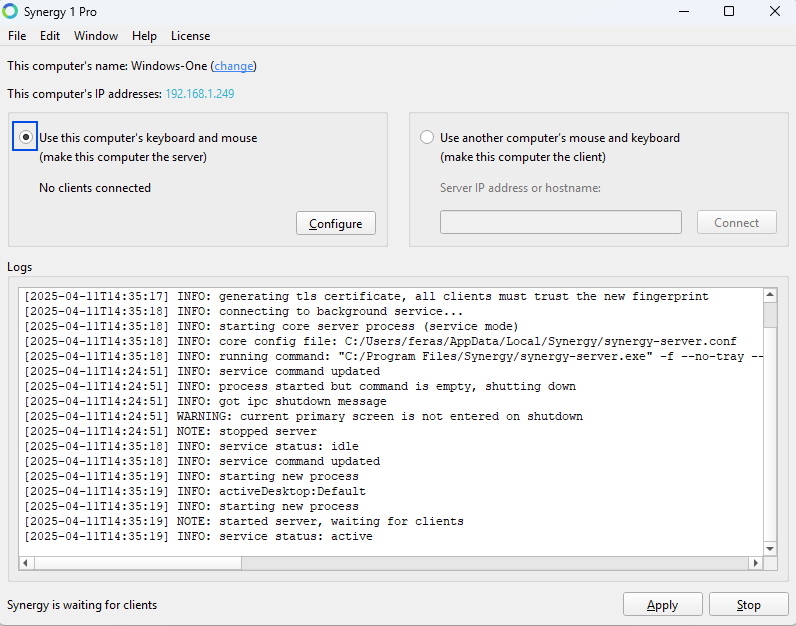- Synergy 1 installed on each computer