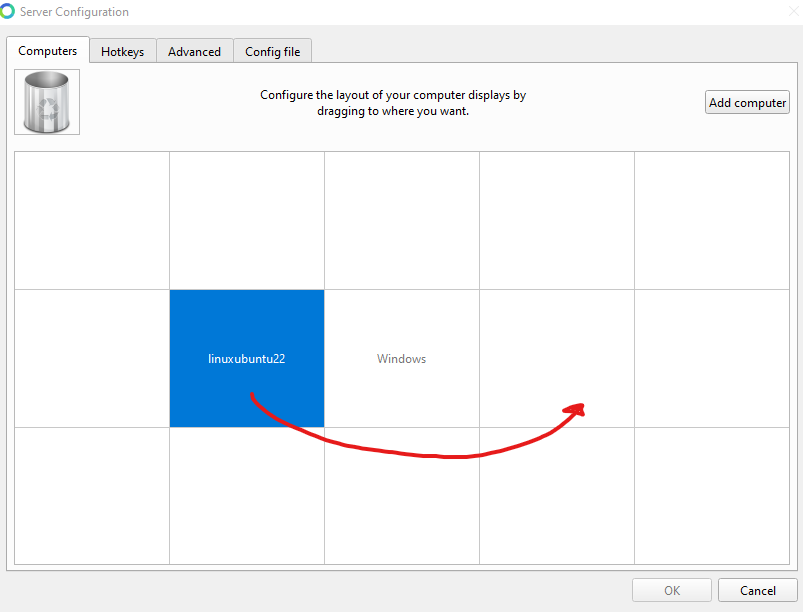 Once connected, Synergy will place the client computer next to the server in the layout. However, this may not match with the physical arrangement, and can be easily changed by clicking and dragging: